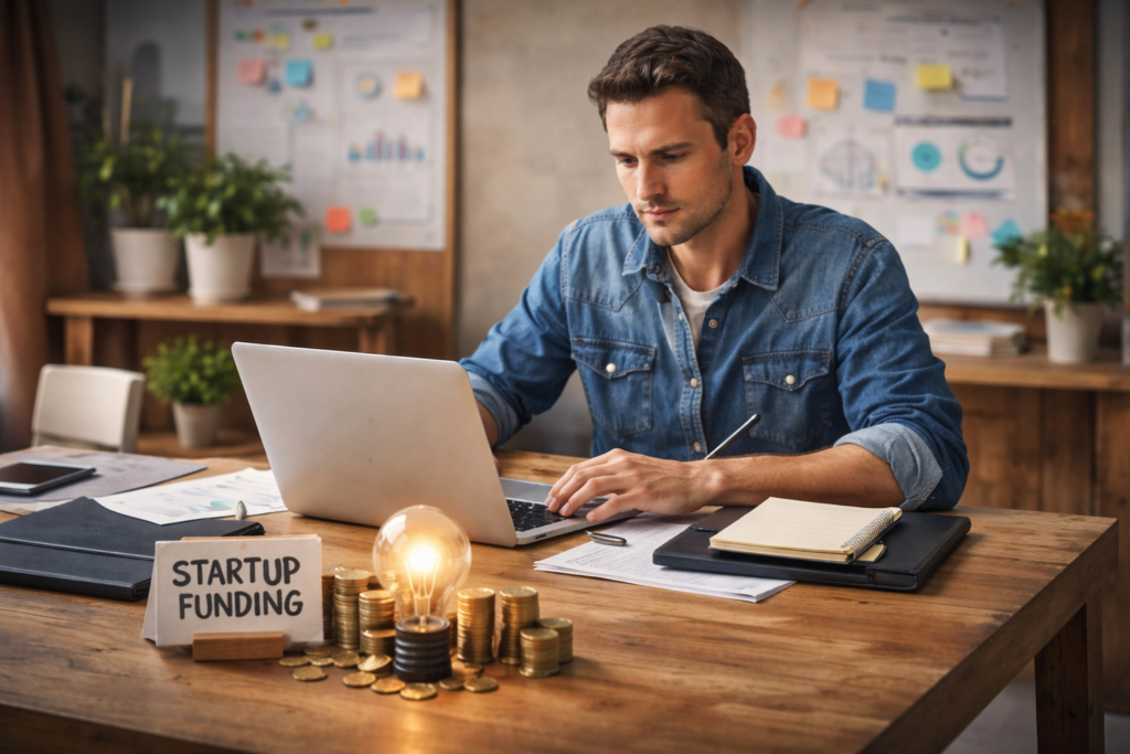Entrepreneur planning finances on laptop with text “How to Get a Startup Business Loan With No Money” and funding steps graphic