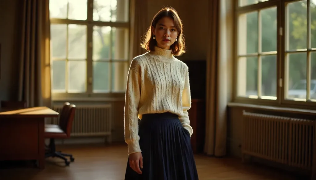 Knitwear is the heart of preppy softness. Cable-knit sweaters, cardigan sets, and ribbed vests bring warmth while keeping the outfit polished.